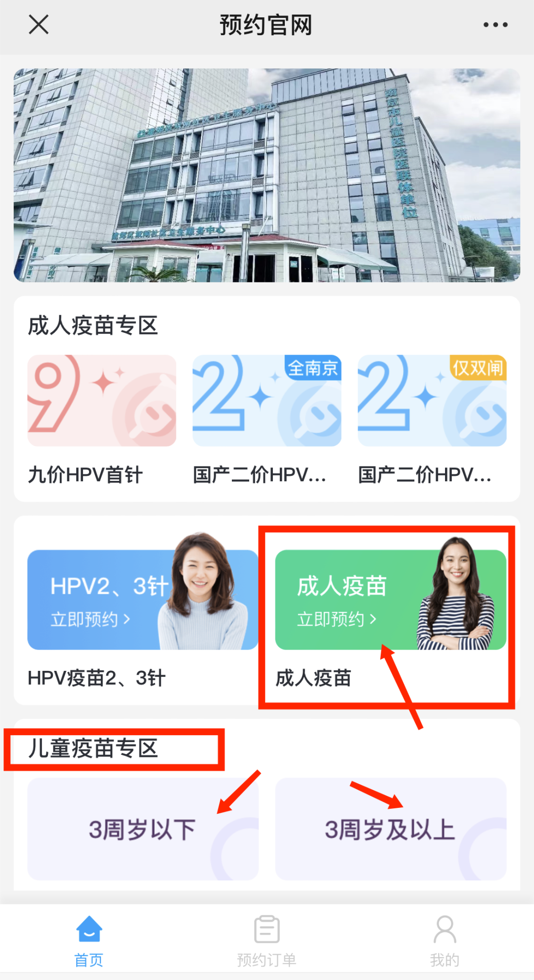 点击公众号菜单栏“预约服务”—“预约官网”—点击“儿童疫苗专区”或“成人疫苗"即可进入预约。(点击查看)