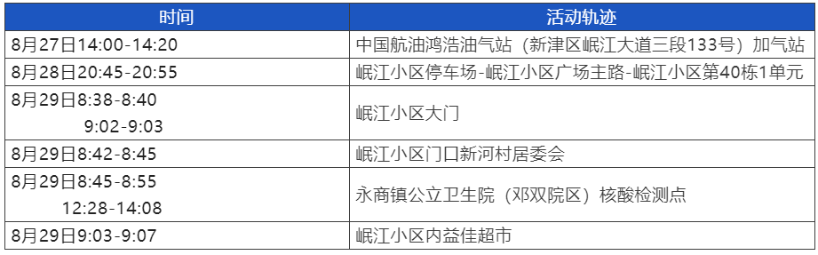 2022年8月30日,成都市新津区新增本土确诊病例1例,居住在永商镇岷江小区。为方便群众排查风险轨迹,现将病例活动轨迹整理如下,请群众对照自查。如与以下活动轨迹有重叠,请立即向社区报备,做好个人防护,及时到就近的核酸检测点进行三天三检(两次核酸检测间隔24小时),核酸结果未出前不外出,不聚会、不聚餐。如有发热、干咳、乏力、咽痛、嗅(味)觉减退、鼻塞、流涕、结膜炎、肌痛和腹泻等症状,请立即前往就近的发热门诊就诊。如您接到疾控部门电话被判定为密接、次密接,请按照要求配合管控。