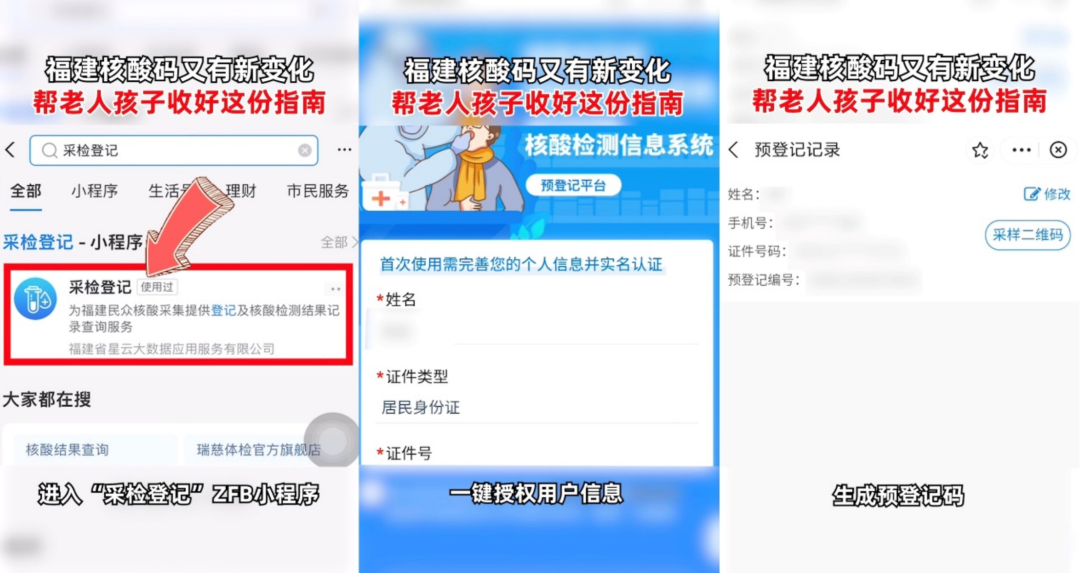 为落实防控措施,加快福建省区域核酸检测信息采集效率,核酸码又有新变化,福建省内核酸采样小程序“采检登记”新增支付宝渠道。市民可通过支付宝首页,搜索“采检登记”进入“采检登记”支付宝小程序,一键授权用户信息,生成预登记码。