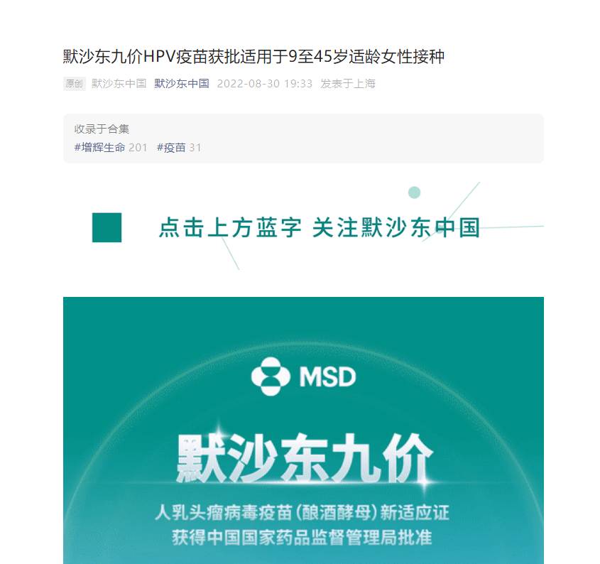 2022年8月30日,默沙东宣布,其九价人乳头瘤病毒疫苗(酿酒酵母)(下称“九价HPV疫苗”)的新适应症已获得中国国家药品监督管理局批准,用于9-45岁适龄女性接种。