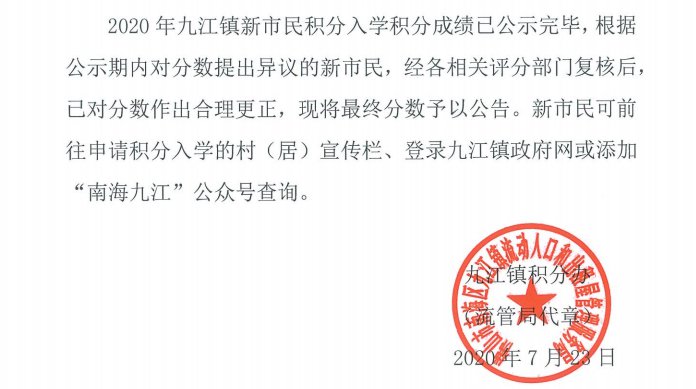 | 2020年九江镇新市民积分入学积分结果公告(小学一年级) | ||||||