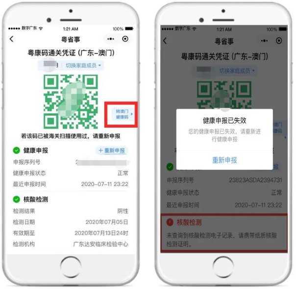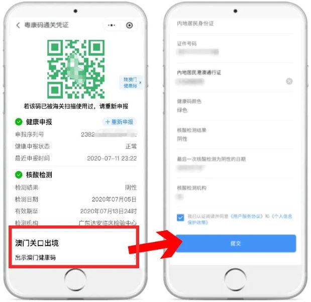 首先在粤澳检测互认的核酸检测机构进行核酸检测,并登录“粤康码”,凭“粤康码”绿码,进行出入境健康申报后获取“粤康码通关凭证”。