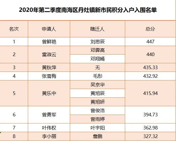 2020年第二季度南海区丹灶镇新市民积分入户积分汇总工作已完成,根据《佛山市新市民积分制服务管理办法》(佛府办〔2018〕45号)和《关于2020年度南海区积分入户指标数和分配方案的通知》规定,该季度丹灶镇入户指标数为25个。本着公平、公正、公开的原则,现将2020年第二季度南海区丹灶镇新市民积分入户分数及排名予以公示,市民可登陆佛山市南海区丹灶镇政府网查询。