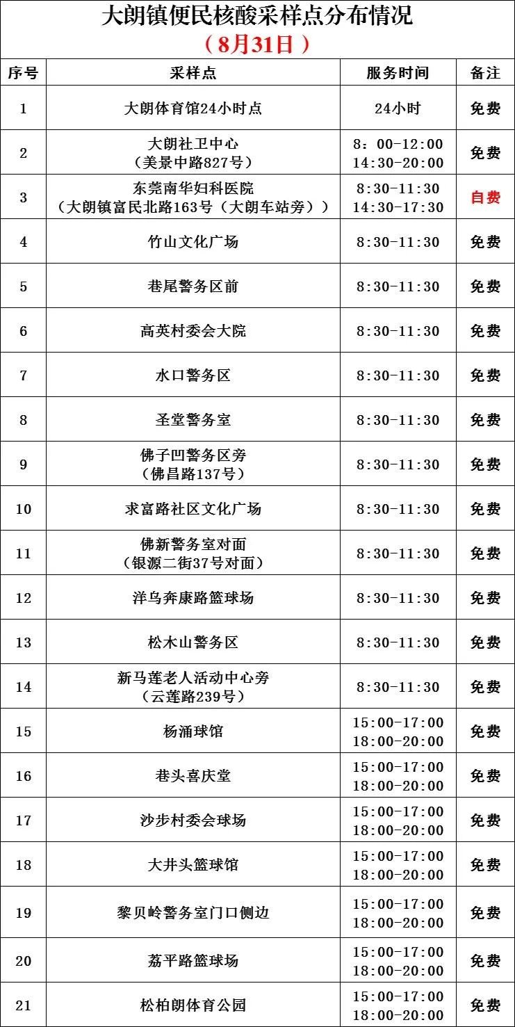 除筛查的村(社区)外,大朗还设置21个便民采样点,重点人群可就近前往免费检测,具体安排如下: