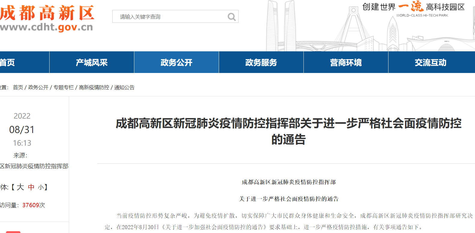 成都高新区发布通告进一步严格社会面疫情防控(8月31日)