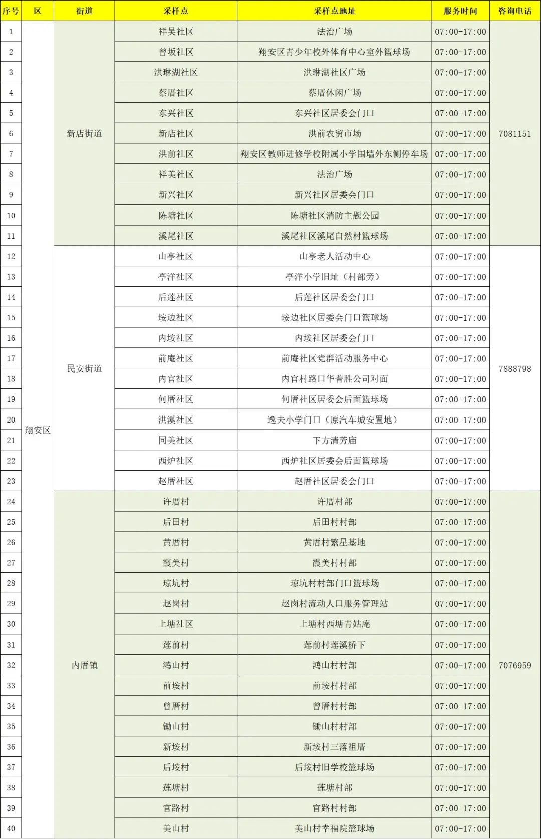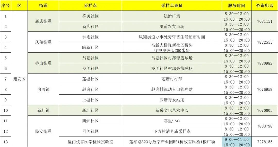 我区于新店街道、民安街道、内厝镇集中开展核酸检测,以上镇街居民,可前往社区核酸采样点进行检测。