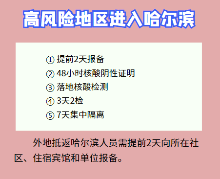 国内高风险地区人员返哈时,除需龙江健康码绿码外,还需依照如下政策执行(更新时间:2022年8月31日)