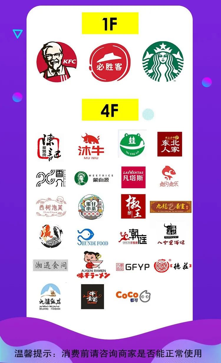 碧发喜宴、星巴克、龙凤冰室、开枱、客家溪语、喜欢你粤式小馆、法兰度航空餐厅、小肥羊、鱼功夫酸菜、鲜小哥卜卜贝、花火韩国料理、吉姆大师傅、张阿姨奶茶、三不牛腩、江鱼儿、榴魔皇、囍鱼肴、蛙小侠、茶词。