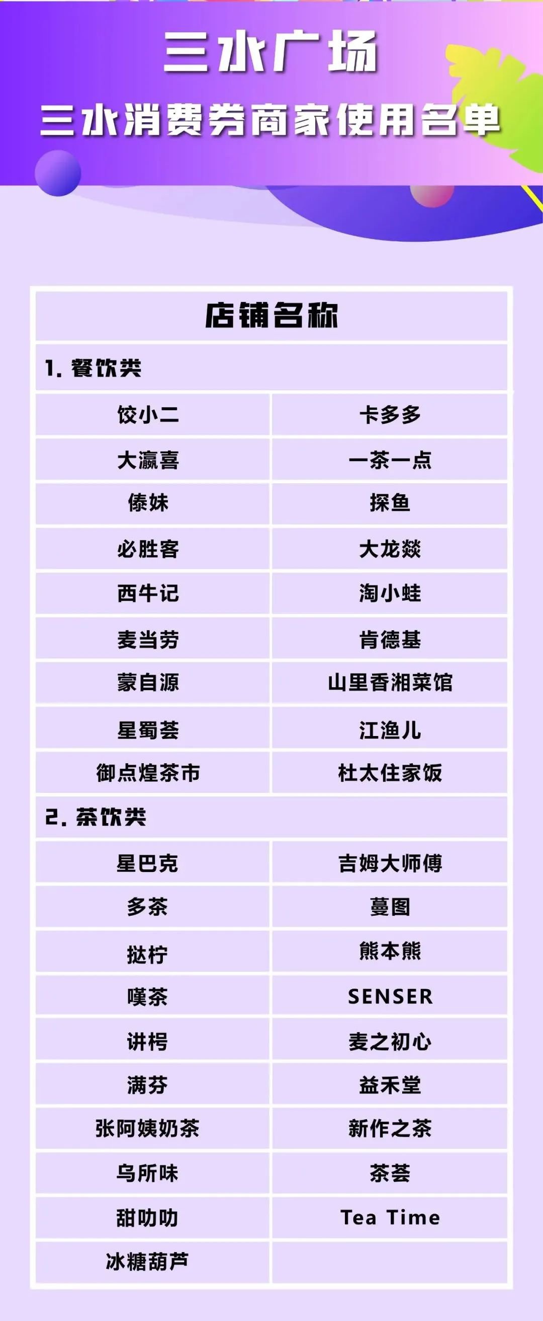 ❀其他餐饮店:西南酒店;沙头堤围福味居农庄;红太阳川菜馆;张边远记面馆;阿俪诗家蛋糕店;明食农庄;沸腾砂锅麻辣烫;墨绿花艺烘焙;李时珍、功夫一家、益和堂奶茶、澳盈梦马西餐厅、胜记艇仔粥、变态海南鸡饭、华莱仕、辣辣寿司、友幸、西南月桂二路的老城区小郡肝串串火锅店;同福路谷村寿司、日式创意料理;淼团、罗记冷冻品、东灶鱼头、德亿堡德保分店、新达街聚友阁餐厅、沙头真实惠水果店、站前路大醋情、耀华路澳纯乳业、华之屋、时代城正哥;华美、新喜点全部门店、胡桃里、明昌酒楼、明昌十二季喜宴、西酒时光、湘赣故事、金手指面包连锁店、肯德基、麦当劳;人民三路蒸滋味;沾沾美食;文锋中路雄鹰餐厅、罗星小食店;人民二路佛山市拉圖百纳贸易有限公司;功夫客;西南耀华路真正豆腐坊;冠军城海汕记潮汕牛肉火锅店;冠军城茶一巷;喆啡酒店附近恒瑞轩餐厅;园林路美上美;康华路1点甜烘焙;沙头大道醋回味一煲沙头店;囍鱼肴三水钧明汇店;一些柠檬一些茶(三水店);三达路28号芦荟园木瓜芦荟鸡;东海蓝湾荔欧烘焙;恒福新里程阿芙洛芝士榴莲饼;东海街道雅湖半岛FaysTime烘焙休闲馆;好万联百货;展鸿图水果店;实惠佳超市;广兴粮油店;河口下岗村醋意无限;三水河口泮江渔村;河口炸鸡翅。(根据伟大的热心用户和强大的朋友圈整理,具体以实际为准,建议使用前与商家确认是否可用三水消费券)
