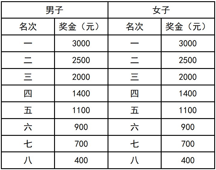 总成绩男、女前八名的选手 (按净计时成绩) ,分别获得奖金 (人民币,单位:元)