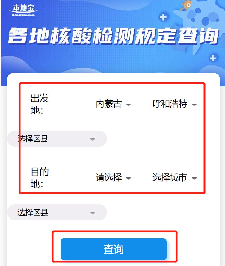 比如:你要从呼和浩特去北京,出发城市选择【呼和浩特】,到达城市选择【北京】,即可查看呼和浩特人员到北京的核酸检测规定。