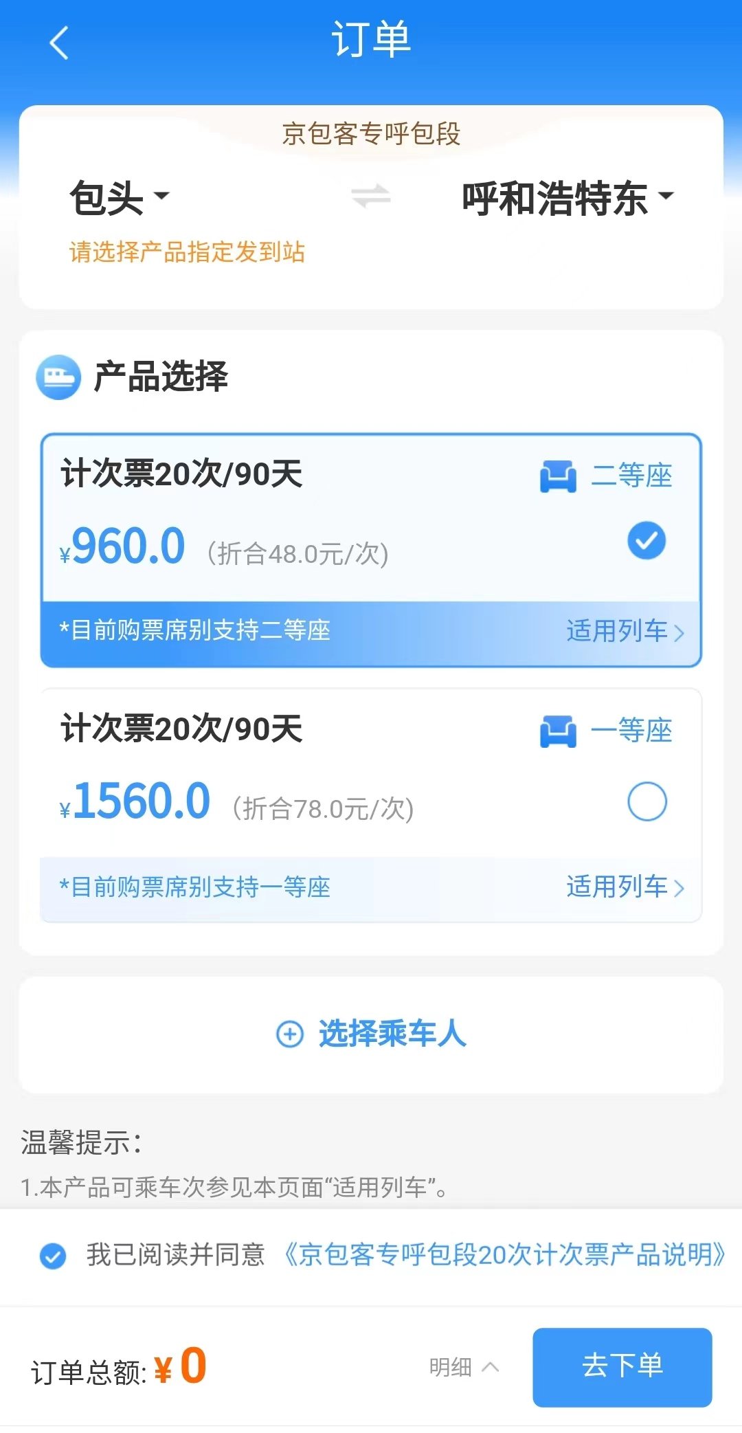 第四步:选择计次票二等座或者一等座,点击“去下单”,完成支付即可。