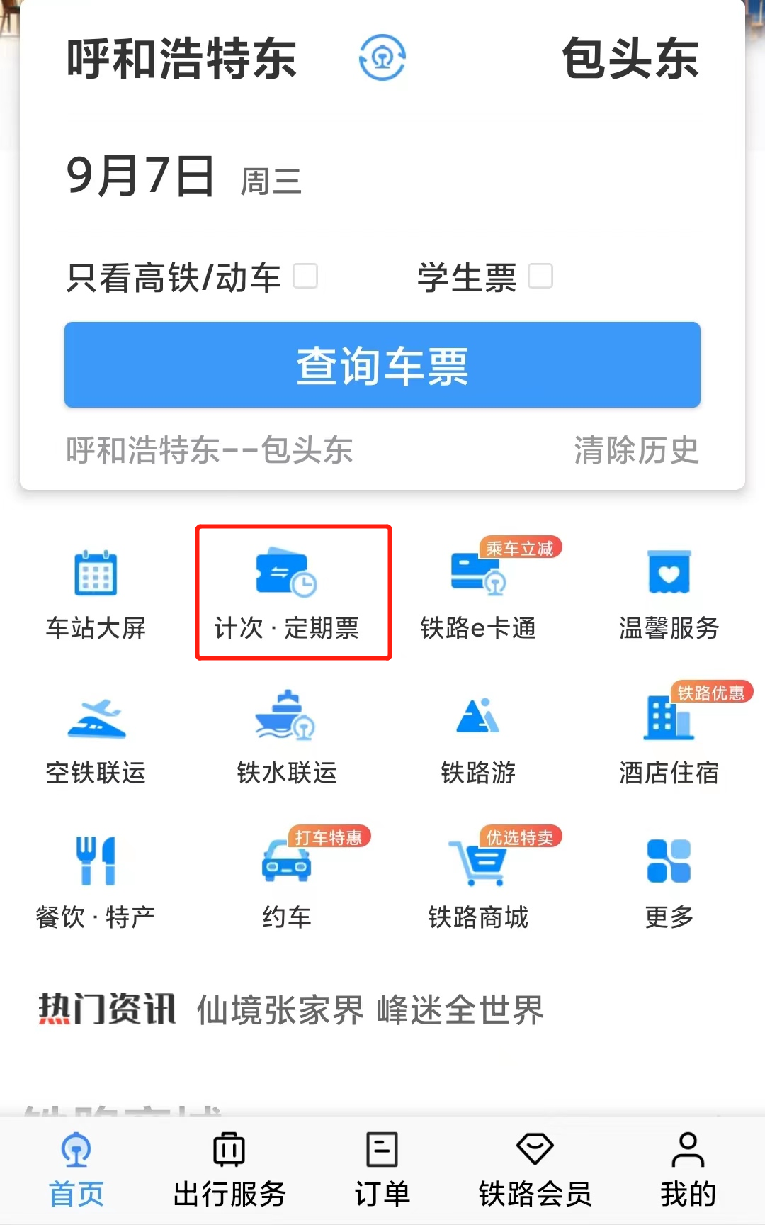 计次票购买教程第一步:进入“铁路12306”手机APP,点击“计次定期票”;