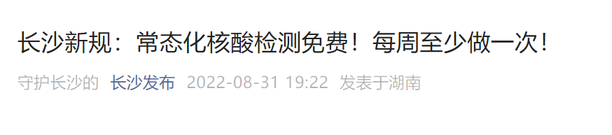 检测频次:长沙市域范围内所有人员,以7天为一个周期至少完成一次核酸检测,即一个星期内,辖区所有人必须进行至少一次核酸检测。风险职业人员和重点机构场所人员核酸检测频次继续按规定执行。