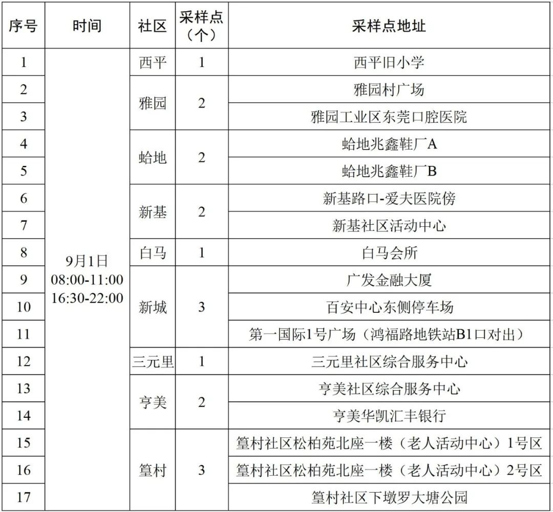 9月1日东莞南城街道9个社区开展核酸检测工作