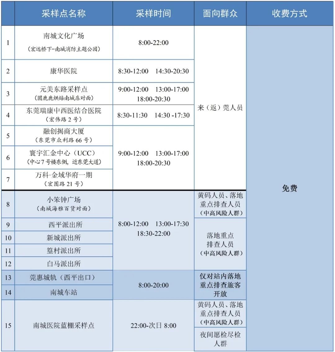 注:来(返)莞人员、夜间愿检尽检人群采样点要求单检的需自费(不超过16元,以现场标价为准)!