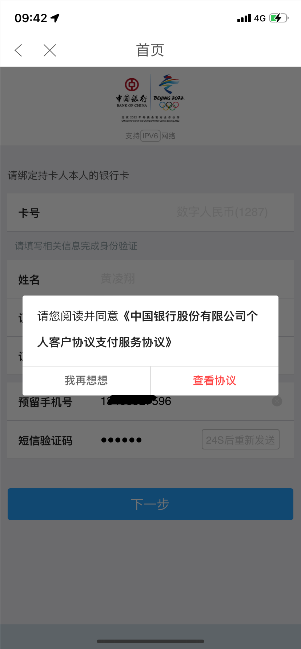 2、中行数币免密认证:输入“卡号”、“手机后四位”和“图形验证码”,点击下一步。(卡号:即数字人民币APP中国银行钱包编号);输入“姓名”、“证件类型”、“证件号”、“预留手机号”,获取“短信验证码”,勾选阅读完整服务协议进行签约。