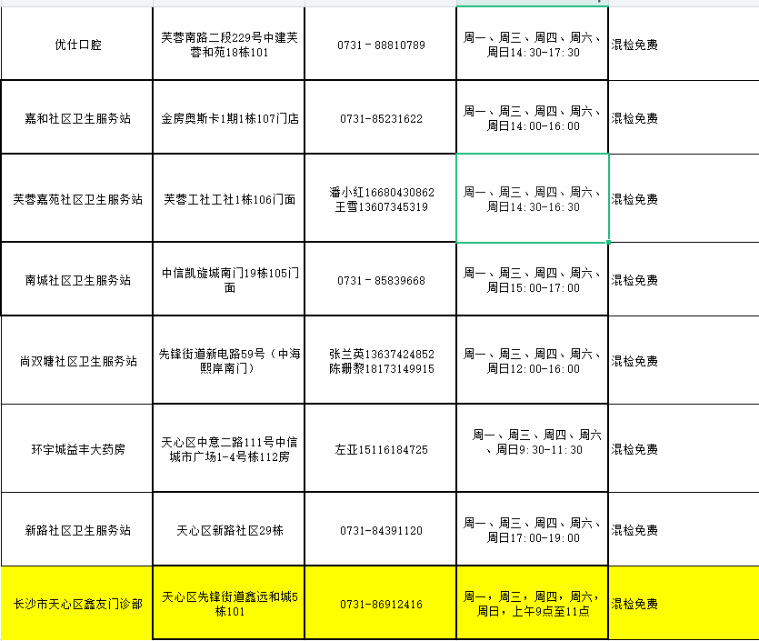 天心区免费做核酸检测的地方