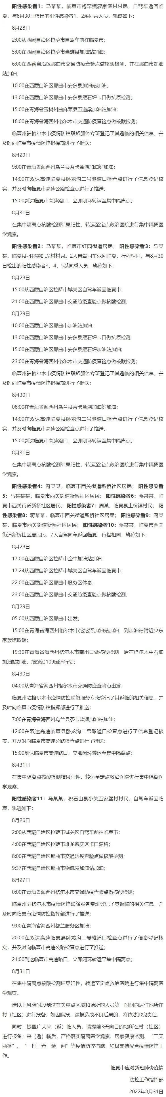 8月31日,甘肃省临夏州临夏市在闭环管理集中隔离管控的重点人群中新检出11例西藏返临新冠病毒阳性感染者。(点此查看)