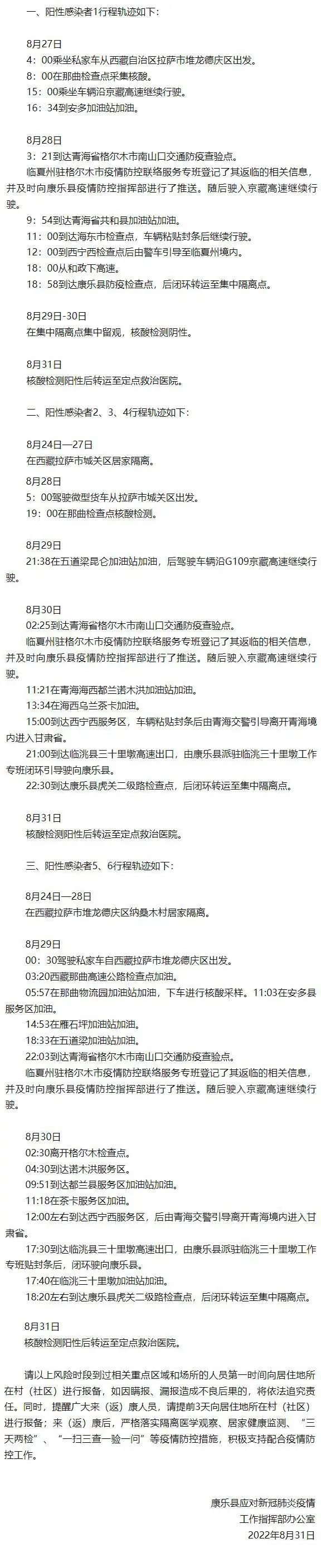 甘肃临夏康乐县31日发现6例西藏返康阳性感染者 行程轨迹公布