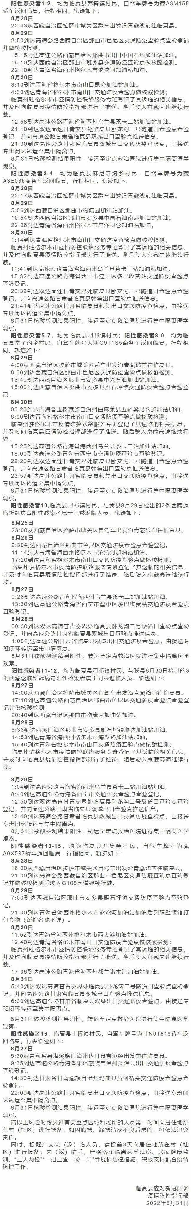 甘肃省临夏回族自治州临夏县应对新冠肺炎疫情防控指挥部刚刚发布通告,2022年8月31日,临夏县在闭环管理集中隔离管控的重点人群中检出16例省外返临新冠病毒阳性感染者。(点此查看)