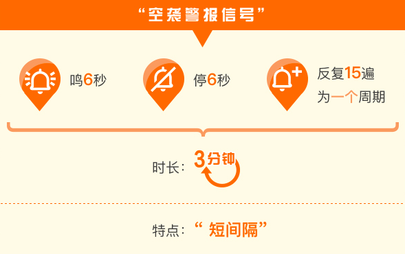 空袭警报(10:50-10:53)用途:空袭警报是在敌方对我方将要攻击时发放。鸣响方式:鸣6秒,停6秒,15遍为一个周期。