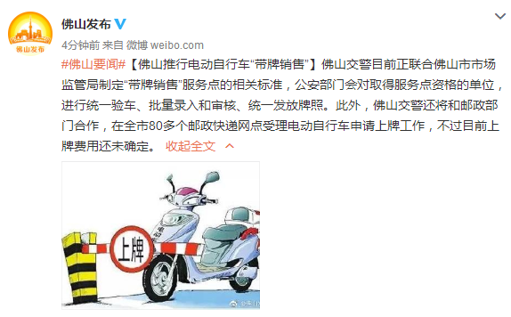 佛山交警目前正联合佛山市市场监管局制定“带牌销售”服务点的相关标准,公安部门会对取得服务点资格的单位,进行统一验车、批量录入和审核、统一发放牌照。此外,佛山交警还将和邮政部门合作,在全市80多个邮政快递网点受理电动自行车申请上牌工作,不过目前上牌费用还未确定。
