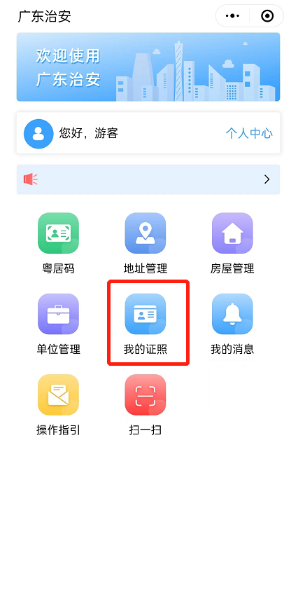 1、搜索“粤居码|粤治安”微信小程序,或直接扫描二维码进入小程序。