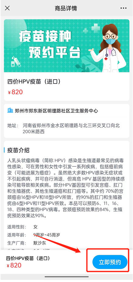 点击【预约中心】—【HPV疫苗专区】—“选择(进口四价HPV预约)”—【立即预约】
