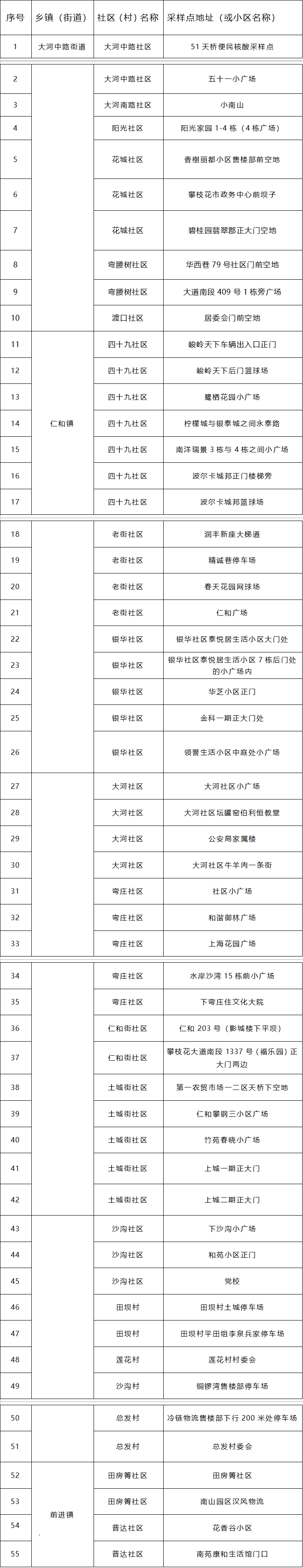 仁和区核酸检测采样点设置清单