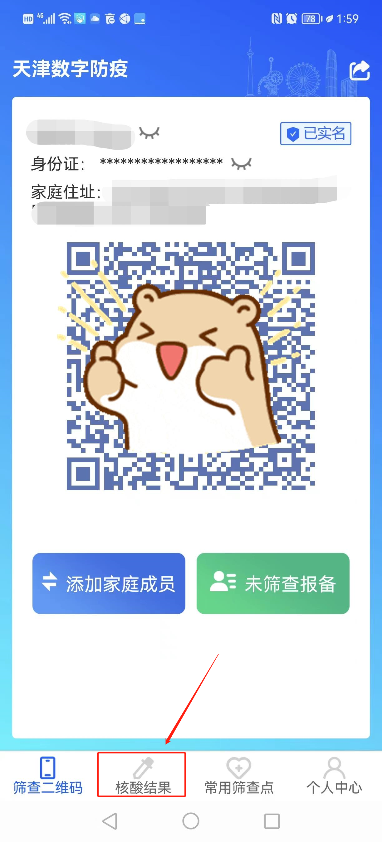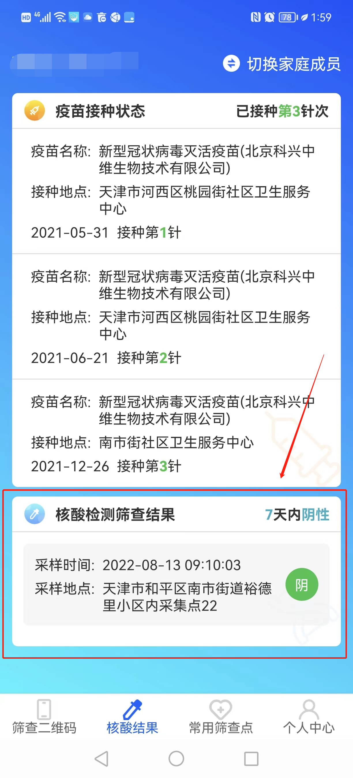 4、点击右上角“切换家庭成员”,还可切换查看家人的核酸检测结果。