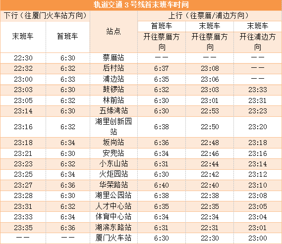 2、行车交路:小交路(原厦门火车站站至五缘湾站)调整为厦门火车站站至浦边站,大交路仍为厦门火车站站至蔡厝站。
