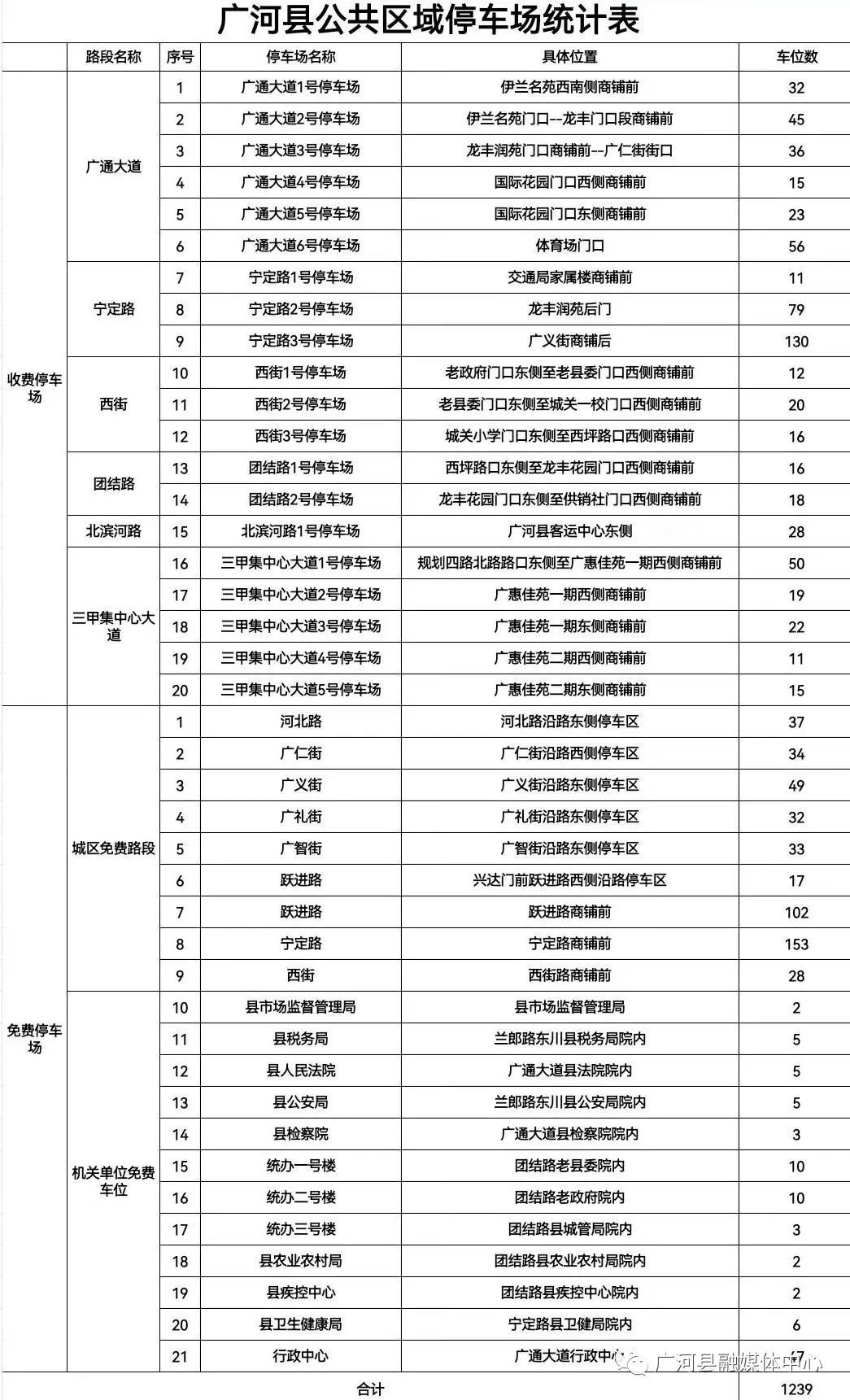 二、在县城西区、广通大道、宁定路、滨河路、广义街等部分路段设置21个停车场709个停车位,进行统一收费管理,具体收费标准以发改部门制定的收费管理办法为准。在广仁街、广义街、广礼街、广智街、河北街等路段沿路划定485个免费停车位,供社会车辆有序停放。