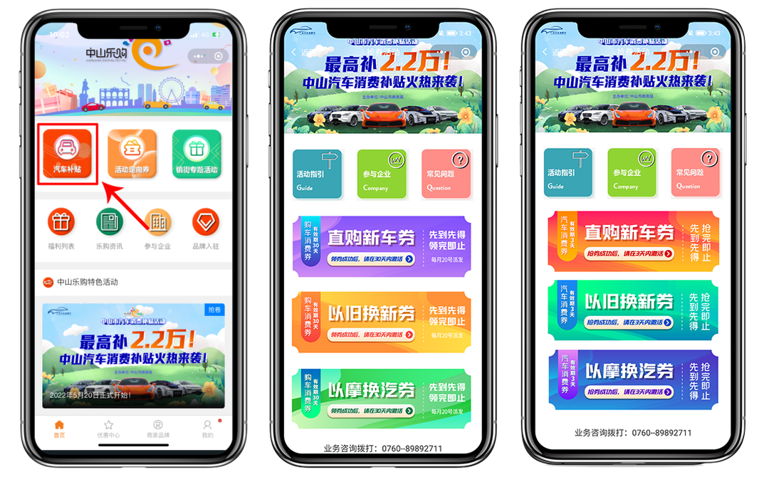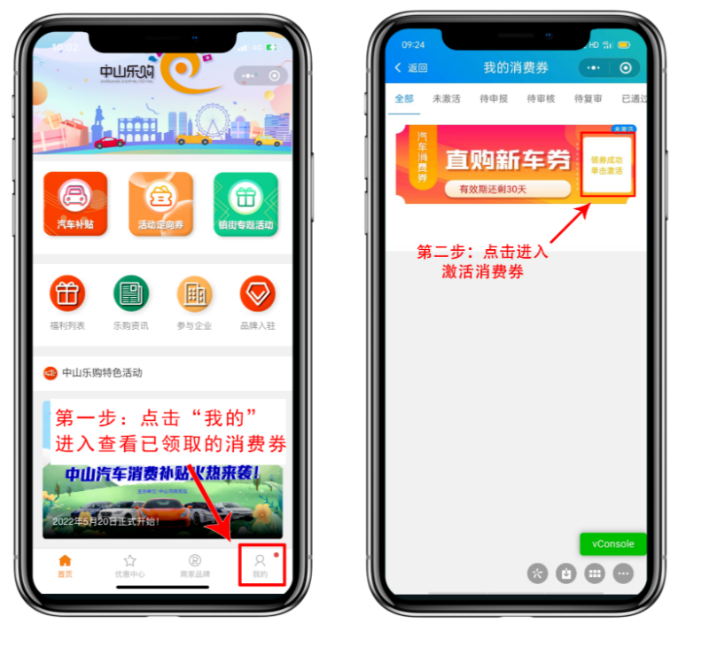 消费者需在消费券有效期内在“中山乐购”小程序中“选择汽车类型”并上传购车发票激活使用消费券。