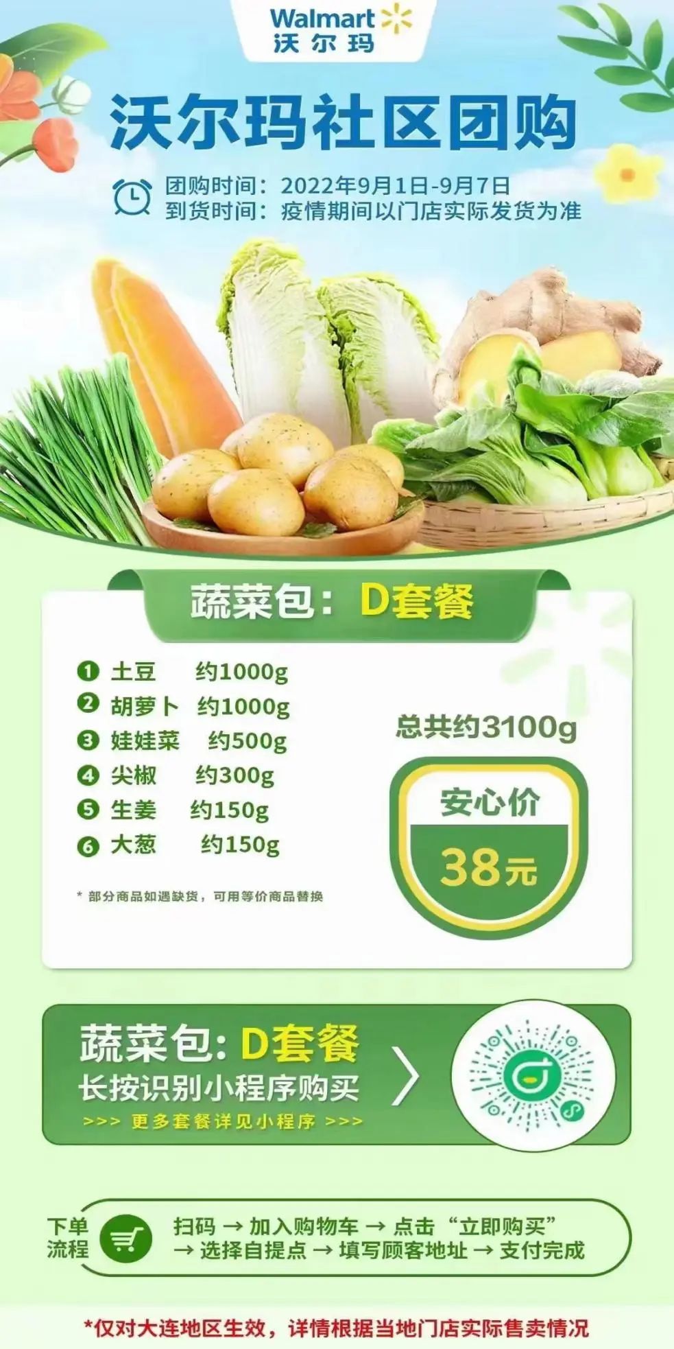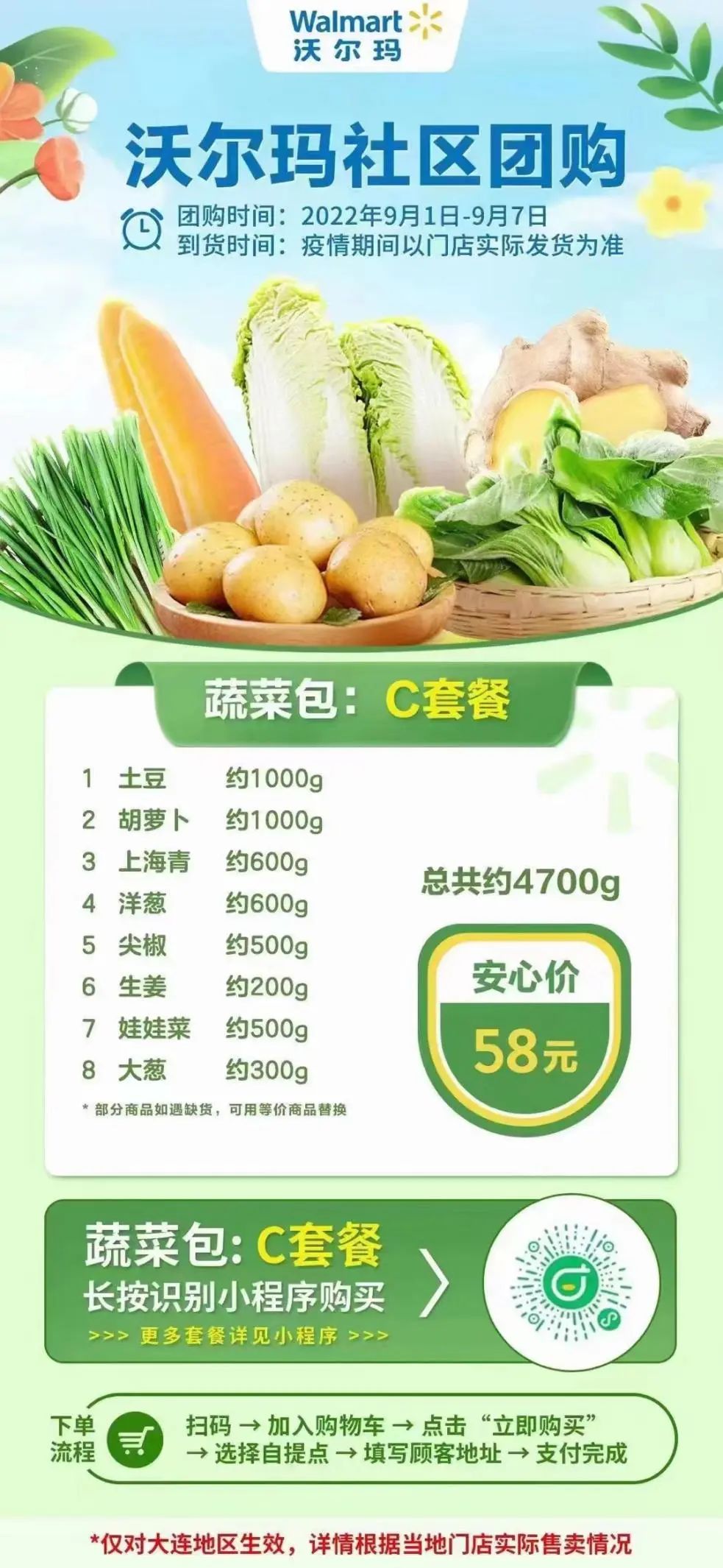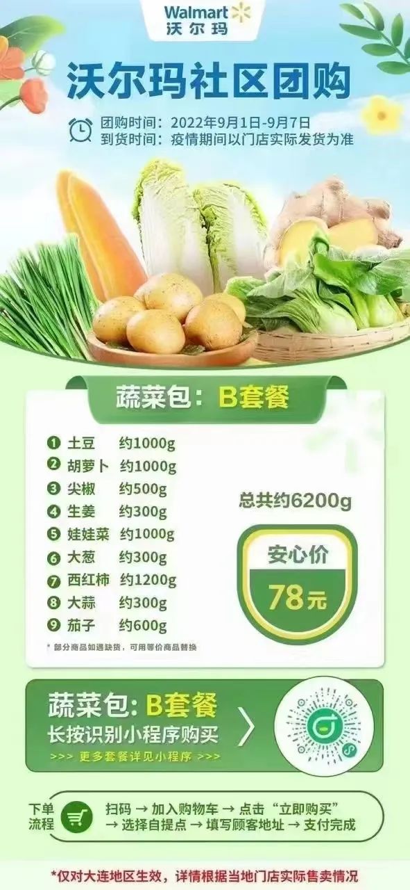 扫码“地利甄选”微信小程序——选择附近“团长”进行下单购买。配送范围暂时覆盖葵英街道、虎滩街道、桃源街道。