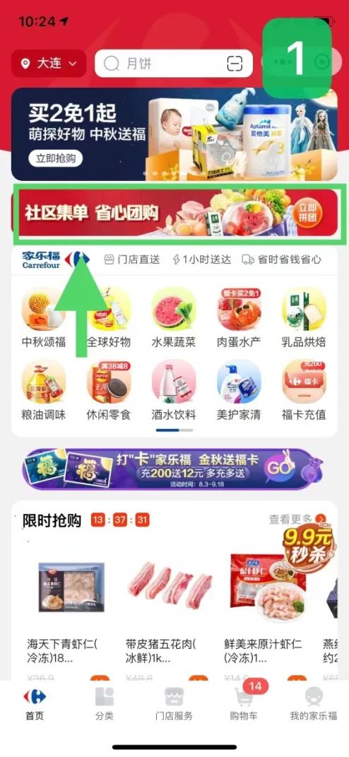 购买阶段:小程序中“社区集单 省心团购”窗口进入。