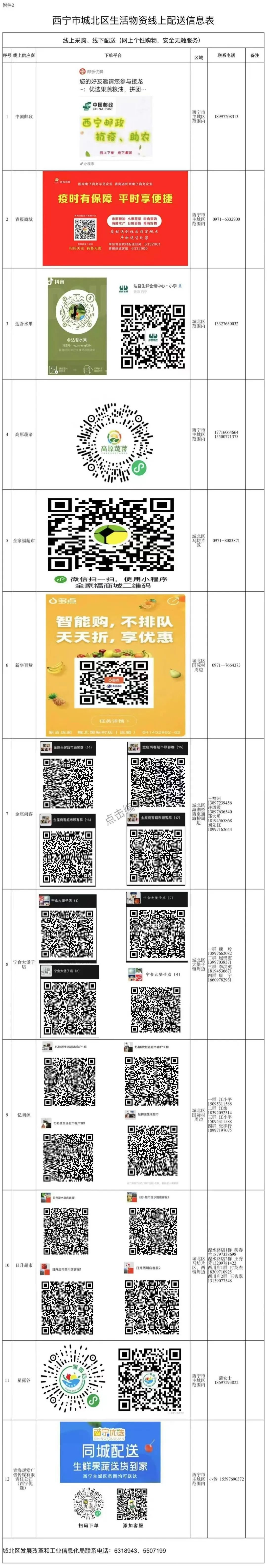 一、每天安排超市、商贸企业车辆进小区“点对点”配送物资;小区(村)内部有零售点的,辖区居民可以下午3点以前在小区购买生活必需品和蔬菜。同时,辖区居民还可以通过中国邮政、青报商城、抖音(达吾)、高原蔬菜等线上平台及重点超市配送群进行线上点单,相关平台及商超当日进行配送,满足群众个性化需求。