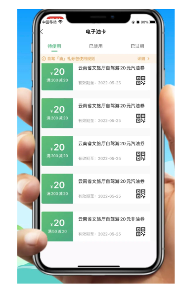 “游云南”App点击【我的】,头像下方找到【加油卡】,点击即可查看领取成功的加油券,包括加油券面值、有效期、使用规则和核销码等。