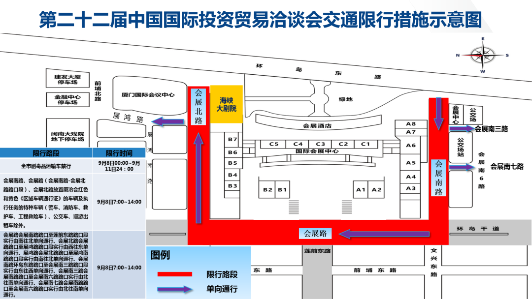 2022年9月8日7时至14时,国际会展中心及会展南路、会展路会展南路路口至会展北路路口段、会展北路禁止机动车通行,放置第二十二届中国国际投资贸易洽谈会红色或黄色《区域车辆通行证》的机动车及执行任务的特种车辆(警车、消防车、救护车、工程救险车)、公交车、巡游出租车除外。
