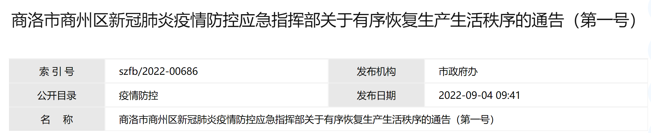 自2022年9月4日8时起,商洛商州区逐步解除静态管控,有序恢复低风险区居民生产生活秩序。