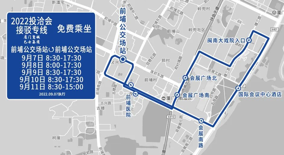 (二)停靠站点:前埔公交场站、前埔医院、会展广场南(虚拟站)、会展广场北(虚拟站)、闽南大戏院入口(虚拟站)、国际会议中心酒店(虚拟站)、会展南路(虚拟站)、前埔医院、前埔公交场站。