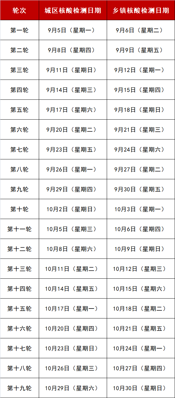为巩固我市疫情防控成果,为党的二十大胜利召开营造安全稳定的社会环境,根据省、州疫情防控办统一部署,自9月5日至10月31日,全市每3天开展1轮全员核酸检测,现将具体事宜通告如下: