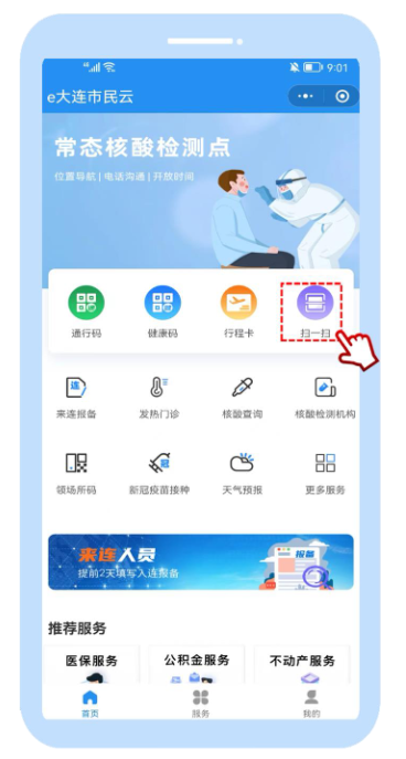 2通过辽事通APP大连频道、“辽事通·e大连”的支付宝小程序、微信小程序,扫描线下“场所码”。(以“辽事通·e大连”市民云微信小程序为例,点击右上角扫一扫)