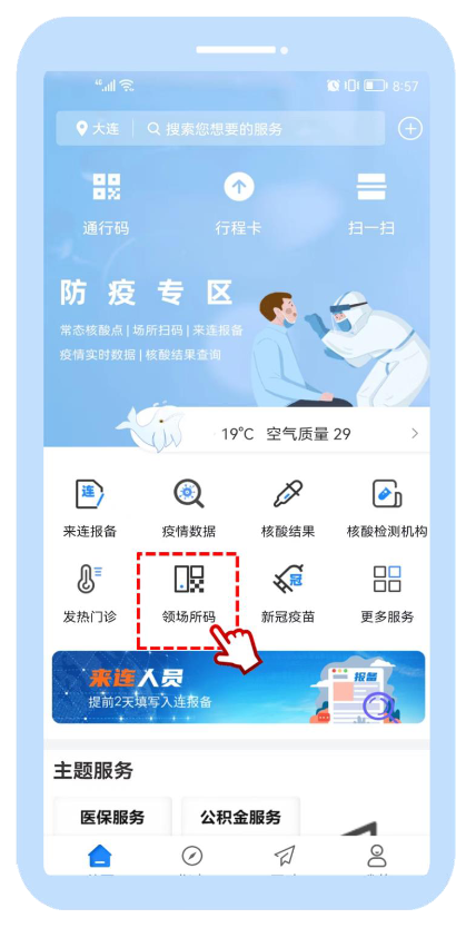 1打开“辽事通·e大连”频道,在首页点击“领场所码”服务。
