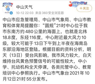 中山市应急管理局、中山市气象局、中山市教育和体育局10月12日晚发布消息: