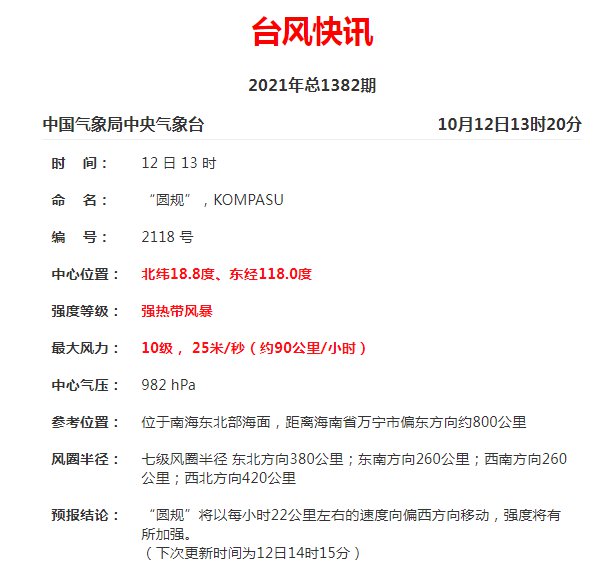 “圆规”21时中心位于我市东南方约480公里的海面上,也就是北纬18.8度,东经116度,中心附近最大风力10级,较大可能于13日下午到上半夜在海南岛东部沿海地区登陆。
