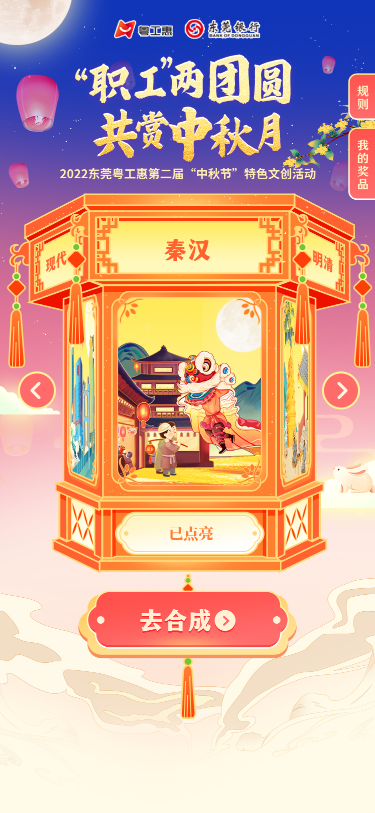 4、每观看完一个篇章即可点亮走马灯对应的灯面,并完成收集天灯制作材料,待所有灯面全部点亮,系统将出现提示“去合成”天灯,点击画面在线动态合成。