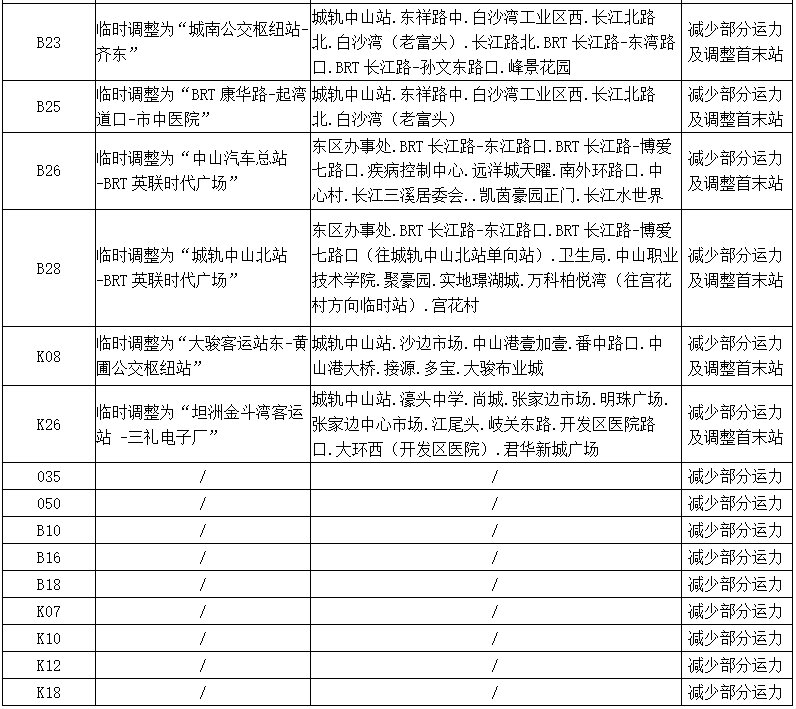 根据上级有关工作部署,因疫情防控需要,即时起,火炬开发区公交线路暂停营运,具体安排如下:公共汽车023、024、030、031、032、033、036、039、042、046、060、061、063、065、068、070、073、095、098、208、209、212、B1、B11、B12、B13、B17、B20、B27、B29、B30、G098、K16、K25、K28、K981路等36条公交线路暂停营运;公共汽车001、002、003、005、018、025、035、050、090、217、218、B10、B16、B18、B19、B23、B25、B26、B28、K07、K08、K10、K12、K18、K26路等25条公交线路临时调整线路首末站及减少运力。调整安排见下表: