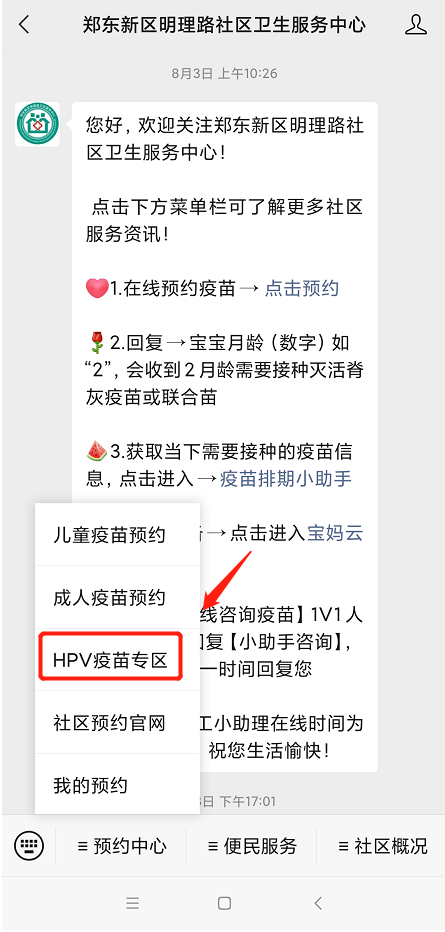 郑东新区明理路社区卫生服务中心门诊部四价HPV疫苗到苗200支,9月9日(本周五)晚上18:00开放预约,请有需要的居民进入公众号进行预约。