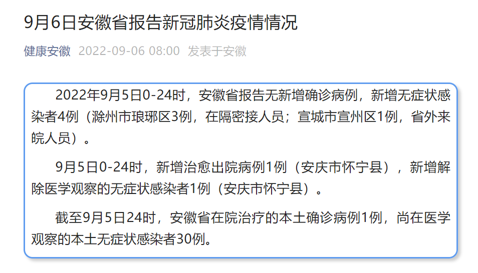 2022年9月5日0-24时,安徽省报告无新增确诊病例,新增无症状感染者4例(滁州市琅琊区3例,在隔密接人员;宣城市宣州区1例,省外来皖人员)。